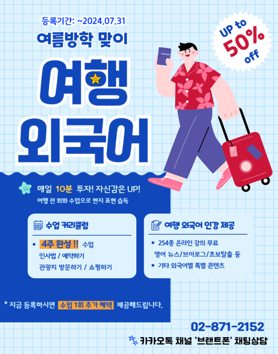 여름 방학 기간을 맞이하여 해외 여행을 위한 전화 외국어 수강 혜택 안내드립니다.